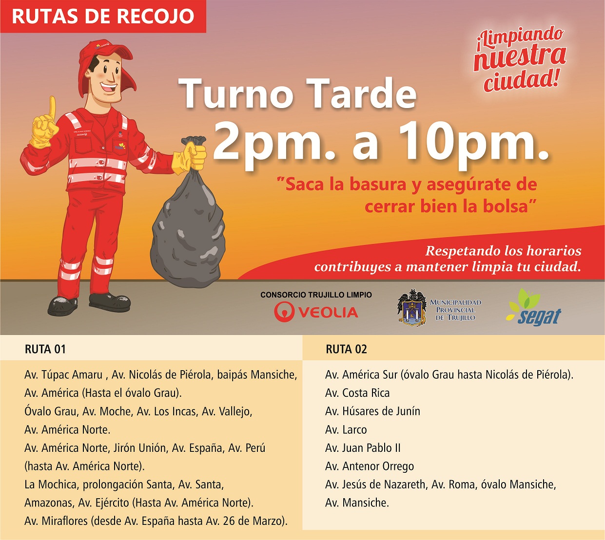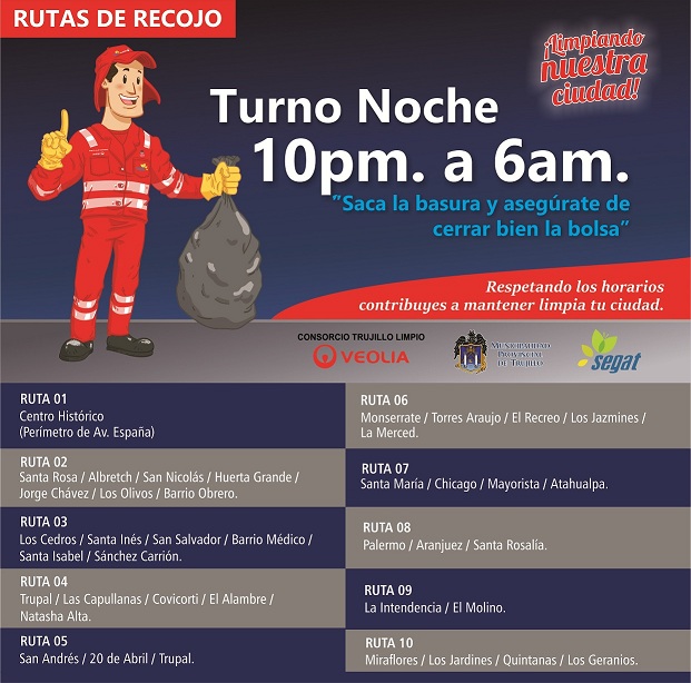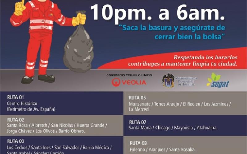 La Municipalidad Provincial de Trujillo a través del Servicio de Gestión Ambiental de Truillo (Segat), informa que se empezó a operar en nuestra ciudad un nuevo y moderno servicio de recolección de residuos, a cargo de la empresa Consorcio Trujillo Limpio.