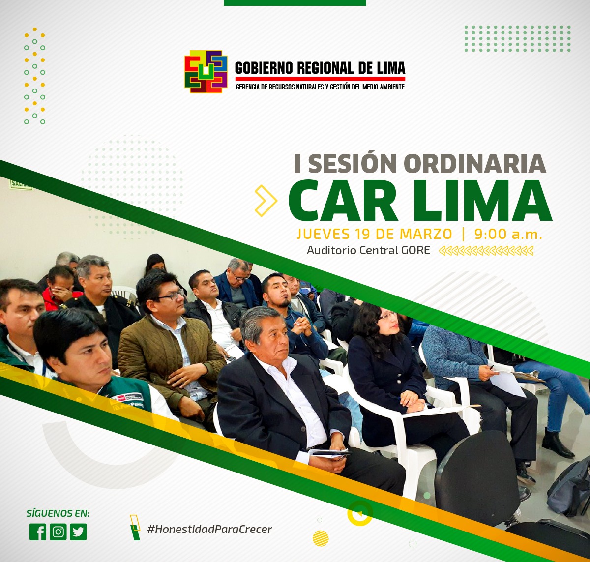 Con la finalidad de promover el dialogo, el acuerdo entre los sectores publico, privado y la sociedad civil, el Gobierno Regional de Lima a través de la Gerencia de Recursos Naturales y Gestión del Medio Ambiente, realizará la I Sesión Ordinaria de la Comisión Ambiental Regional - CAR, el jueves 19 de marzo del año en curso a las 9:00 a.m. en el Auditorio Central – Gerencia Regional Desarrollo Económico - Av. Circunvalación s/n, Agua Dulce - Huacho.
