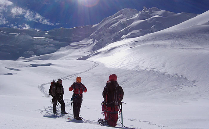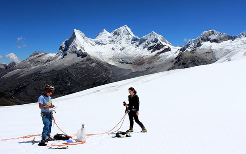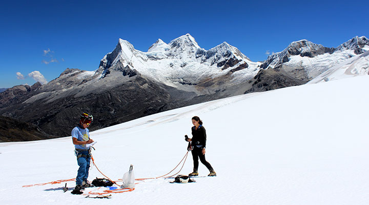 Huaraz, 13 de marzo de 2017.- Investigadores del Instituto Nacional de Investigación en Glaciares y Ecosistemas de Montaña liderados por Wilmer Castillo realizan investigaciones sobre el carbono negro en el glaciar Yanapaccha a 5300 msnm, ubicado frente al nevado Chacraraju de 6200 msnm, uno de los picos más altos y complejos del mundo, en la Cordillera Blanca (Áncash-Perú).
