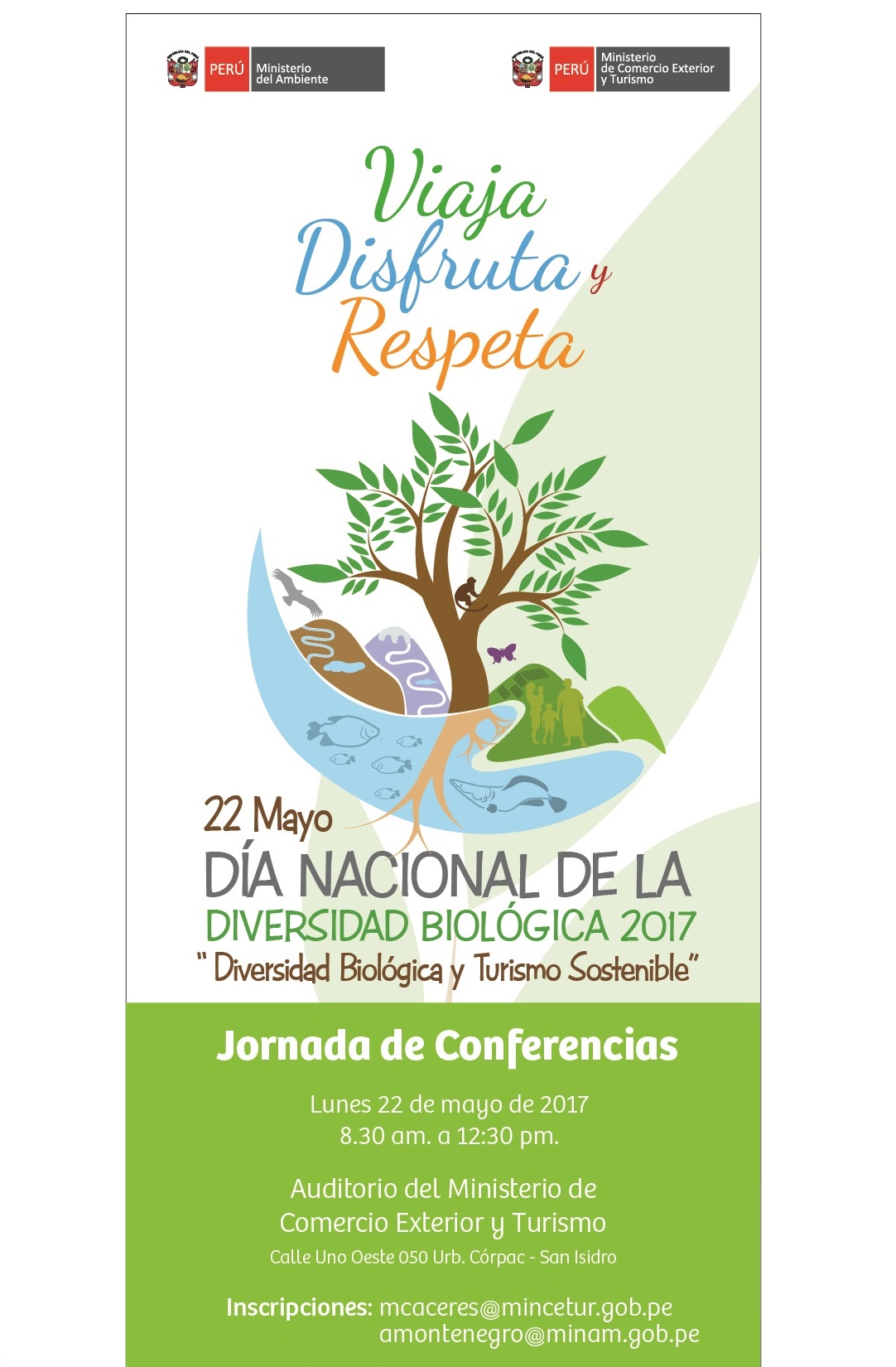 Lima, 17 de mayo de 2017.- El Ministerio del Ambiente (MINAM) y el Ministerio de Comercio Exterior y Turismo (MINCETUR), invitan a participar de las actividades en el marco del Día Nacional de Diversidad Biológica a desarrollarse este 22 de mayo en el Auditorio del MINCETUR (Calle Uno n.°50. Urb. Córpac, San Isidro). De 8:30 a 12:30 horas se desarrollará una Jornada de Conferencias y a partir de las 14:00 horas se llevará a cabo el Evento Central.