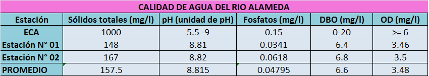 Respecto a los sólidos totales, se observa que nos encontramos dentro de los ECAS, no se registra turbidez de la fuente del río, llegando a valor 157.5 mg/l, debido a la ausencia de turbidez, se estaría registrando flora acuática y posiblemente organismos invertebrados en sus aguas, las que serían benéficas para la vida y oxigenación de la mencionada fuente de agua.