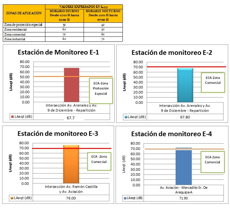 La estación N° 01, se ubica en la intersección, se situa el hospital tipo II, en horario diurno los desibeles deberian estar por debajo de 50 dB por ser una zona especial, sin embargo debido al transito de todo tipo de vehículos, esta cifra se ve incrementada en 17.7 dB, lo que genera un daño ambiental a la tranquilidad de los pacientes del hospital y afectando a su pronta recuperación.
