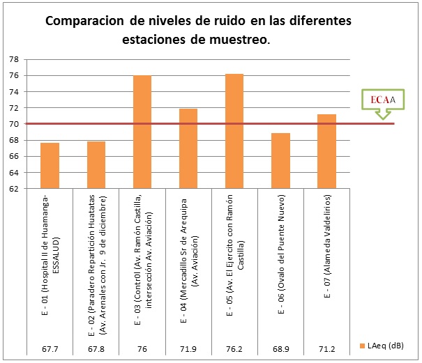 La estacion N° 03, es una intersección de alto tránsito vehícular debido al ruido que generan los vehiculos, estas cifras se incrementan a 6 dB por encima de los ECAS, lo cual es perjudicial para la salud y tranquilidad de las personas que trabajan en las zonas aledañas a este sector.