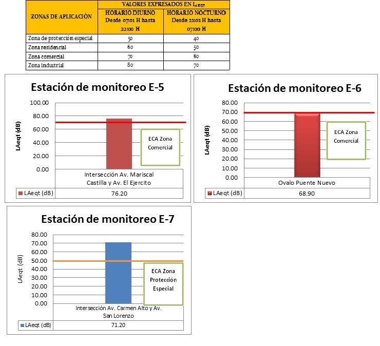 La estación N° 06, ubicada en el ovalo de puente nuevo en cuyo lugar se encuentran instalados semáforos, debido a ello que la emisión de ruidos molestos se encuentran dentro de los estándares de calidad ambiental llegando a 68 decibeles de sonido, apta para zonas comerciales.