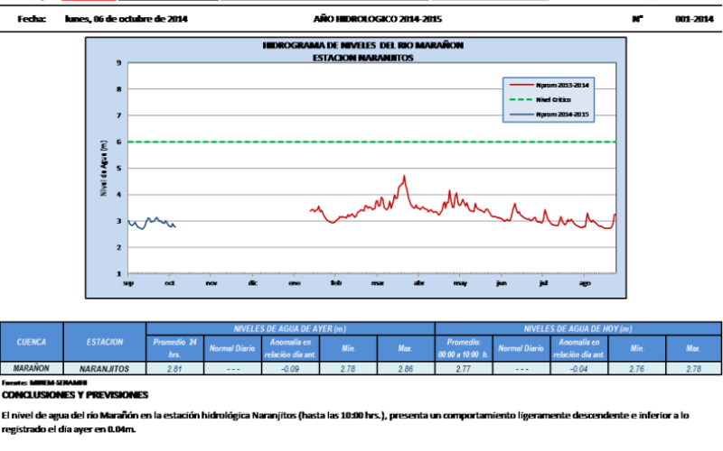 El Servicio Nacional de Meteorologica e Hidrologia a traves de la Dirección Regional de Lambayeque, muestra el reporte hidrologico en la estacion Naranjitos, cuenca del Marañon.