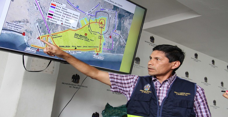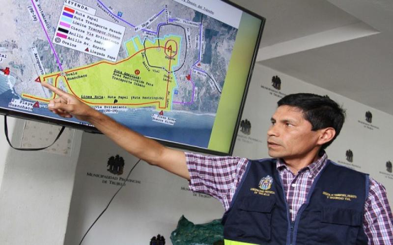 Brindando todas las condiciones para garantizar la seguridad y el orden durante la visita del Papa Francisco a nuestra ciudad, la Municipalidad Provincial de Trujillo (MPT) mediante la Gerencia de Transportes, Tránsito y Seguridad Vial, presentó el plan de desvío de rutas de vehículos, quedando la fiscalización del transporte público a cargo de la comuna edil y de los autos particulares a cargo de la policía de tránsito.