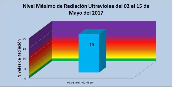 En el gráfico de barras se observa que la Radiación Ultravioleta en la ciudad de Huamanga - Ayacucho, se encuentra en color violeta, lo que indica que la radiación se presenta de manera Extrema a partir de las 9:30 de la mañana hasta las 2:43 de la tarde, en estos horarios el daño es inminente especialmente a la queratina de la piel (envejecimiento prematuro), retina de los ojos por consiguiente formación de cataratas oculares, aparicion y agravamiento de la caspa, hirritacion e inflamacion de partes de la anatomia expuestos al sol, incremento de las pecas y manchas en la piel.