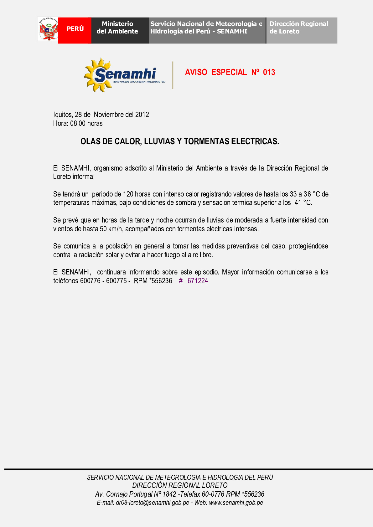 El SENAMHI, organismo adscrito al Ministerio del Ambiente a través de la Dirección Regional de Loreto informa:
