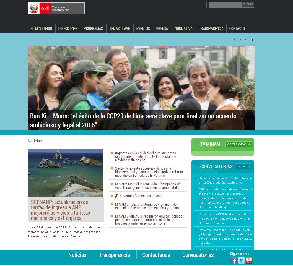 Iniciando el presente año, el portal institucional del Ministerio del Ambiente se renueva mostrando un nuevo diseño que permitirá una mejor experiencia de uso, incorporando novedosas e interesantes secciones como noticias, normatividad, biblioteca digital, estadísticas e indicadores ambientales.