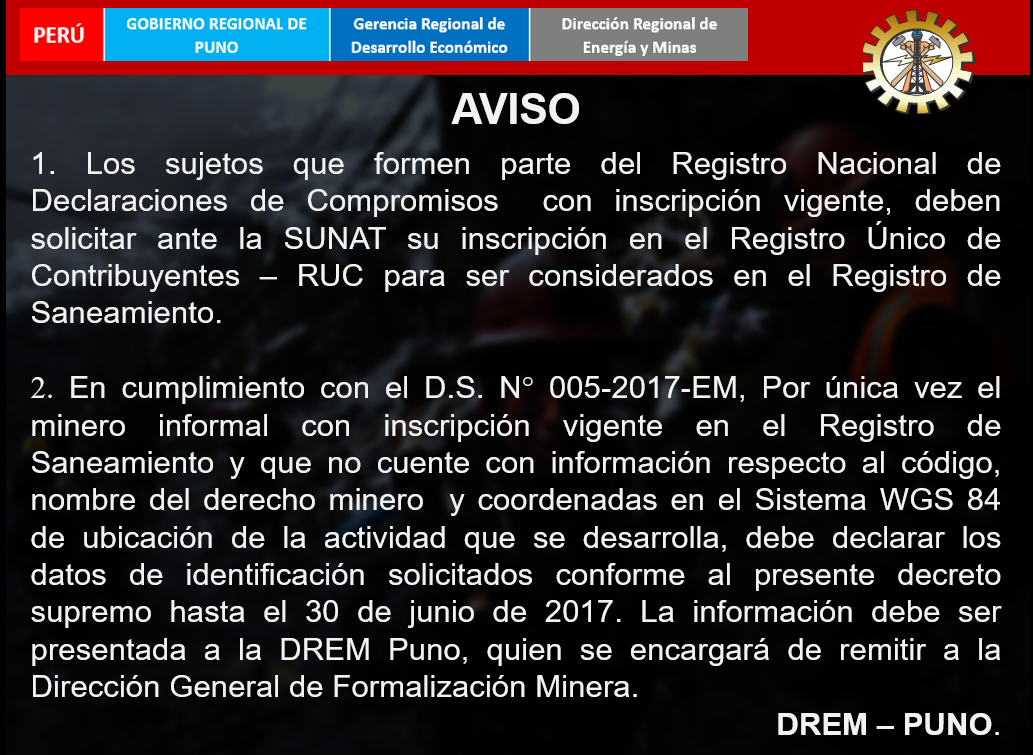 2. En cumplimiento con el D.S. N° 005-2017-EM, por única vez el minero informal con inscripción vigente en el Registro de Saneamiento y que no cuente con información respecto al código, nombre del derecho minero y coordenadas en el Sistema WGS 84 de ubicación de la actividad que desarrolla, debe declarar los datos de identificación solicitados conforme al Decreto Supremo hasta el 30 de junio del 2017. La información debe ser presentada a la DREM – Puno; quien se encargará de remitir a la Dirección General de Formalización Minera.