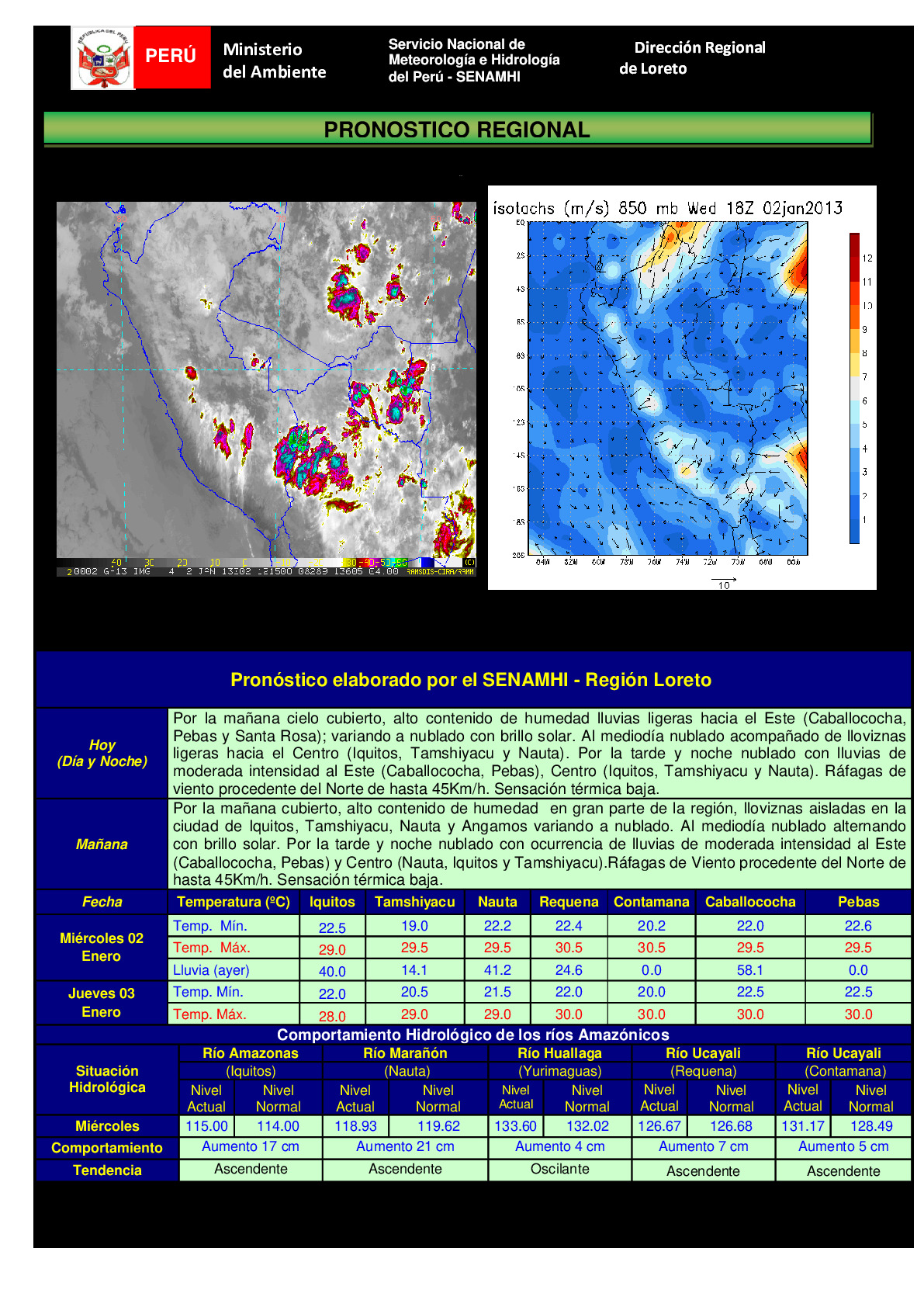 PRONOSTICO REGIONAL DIARIO Y COMPORTAMIENTO HIDROLÓGICO DE LOS PRINCIPALES RIOS AMAZONICOS – 02.ENE.2013
