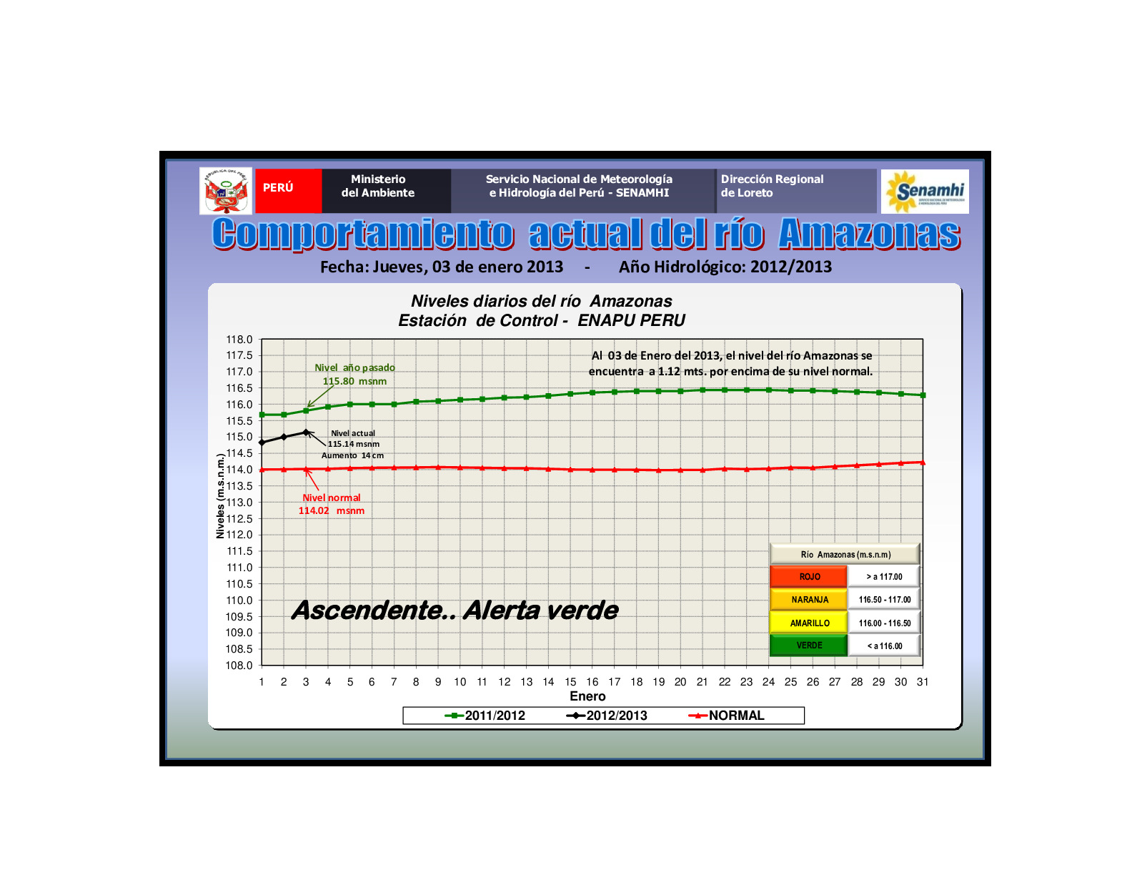 · RioAmazonas, Tendencia ascendente, alerta verde. Al 03 de Enero del 2013, el nivel del río Amazonas se encuentra a 1.12 mts. por encima de su nivel normal. Nivel actual: 115.14 msnm (Aumentó 14 cm)