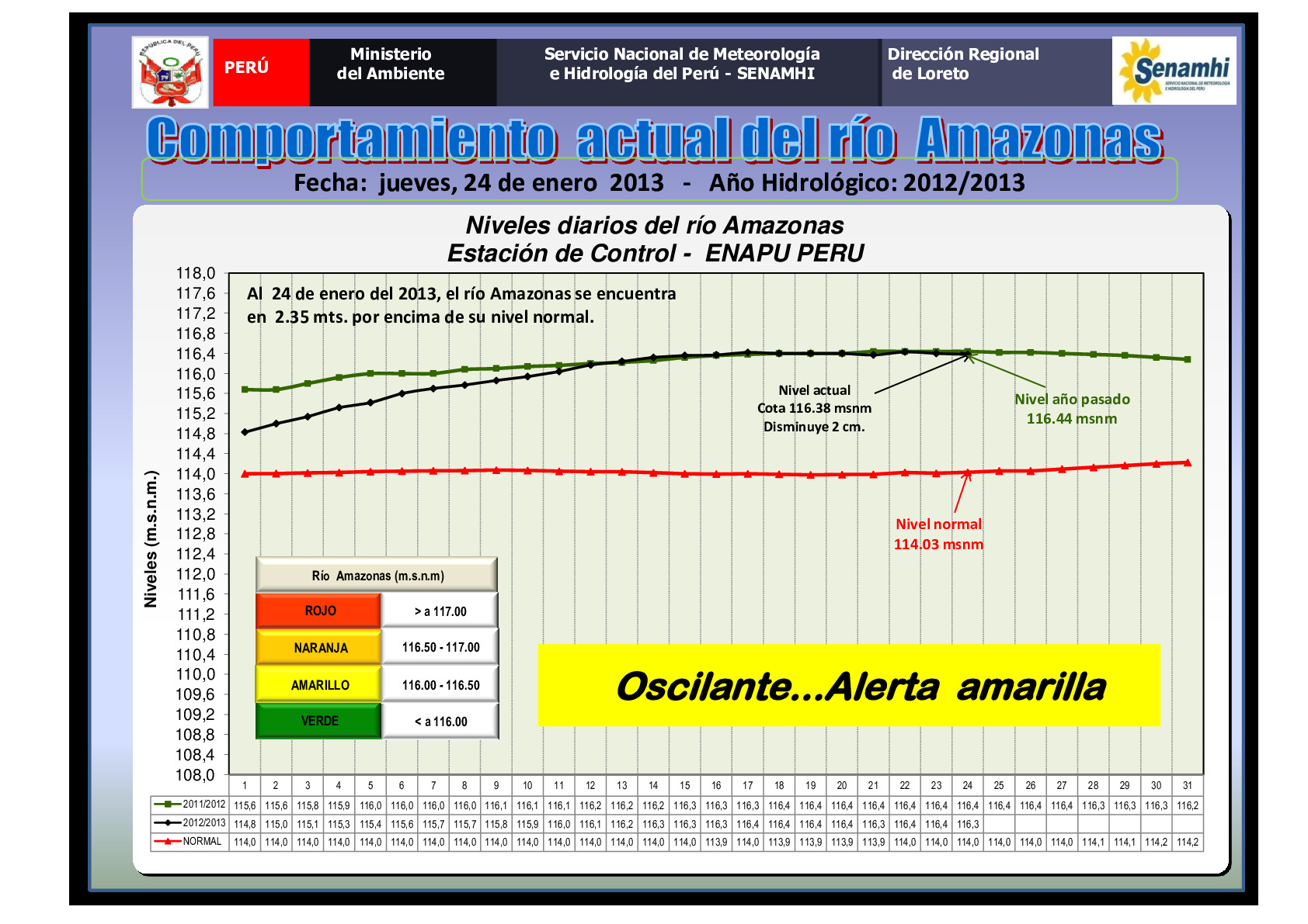 · Rio Amazonas, tendencia ascendente, alerta amarilla; Al 24 de enero del 2013, el rio amazonas se encuentra en 2.35 mts. Por encima de su nivel normal.