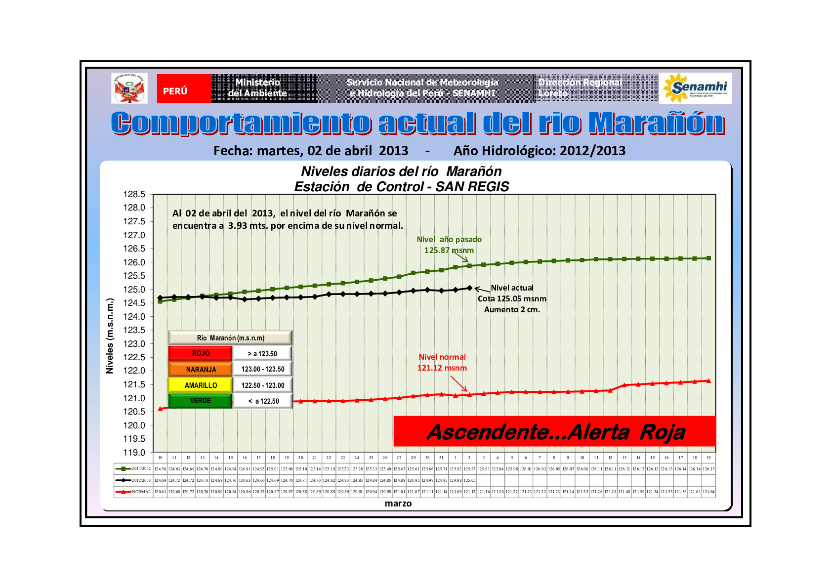 · Rio Marañon, tendencia ascendente, en alerta roja; Al 02 de Abril del 2013, el nivel del río Marañón se encuentra a 3.93 mts. por encima de su nivel normal.