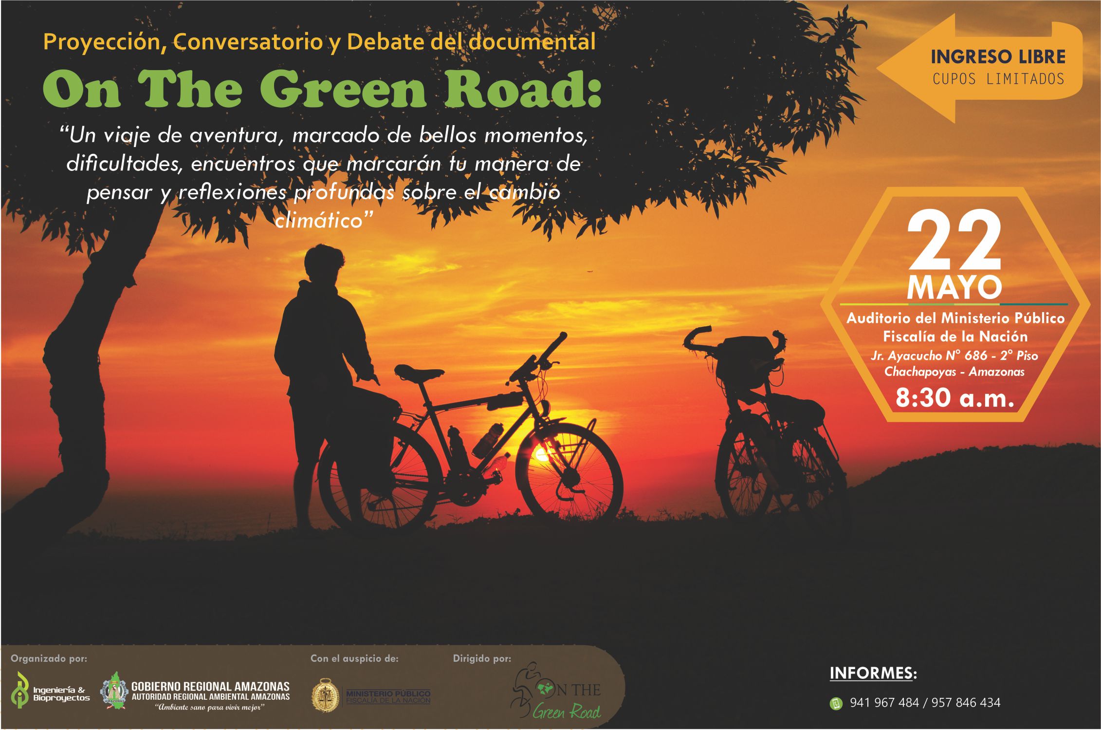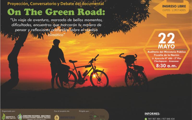 Se proyectará el documental titulado "On The Green Road", que significa “En el camino verde”; al culminar esta proyección se realizará un conversatorio debate con la dirección de Simeón Baldit de Barral (fundador de la ONG) y Alicia Diaz Chauvigné (Coordinadora Internacional de la ONG), en torno a las realidades ambientales y el cambio climático reflejados en el documental.