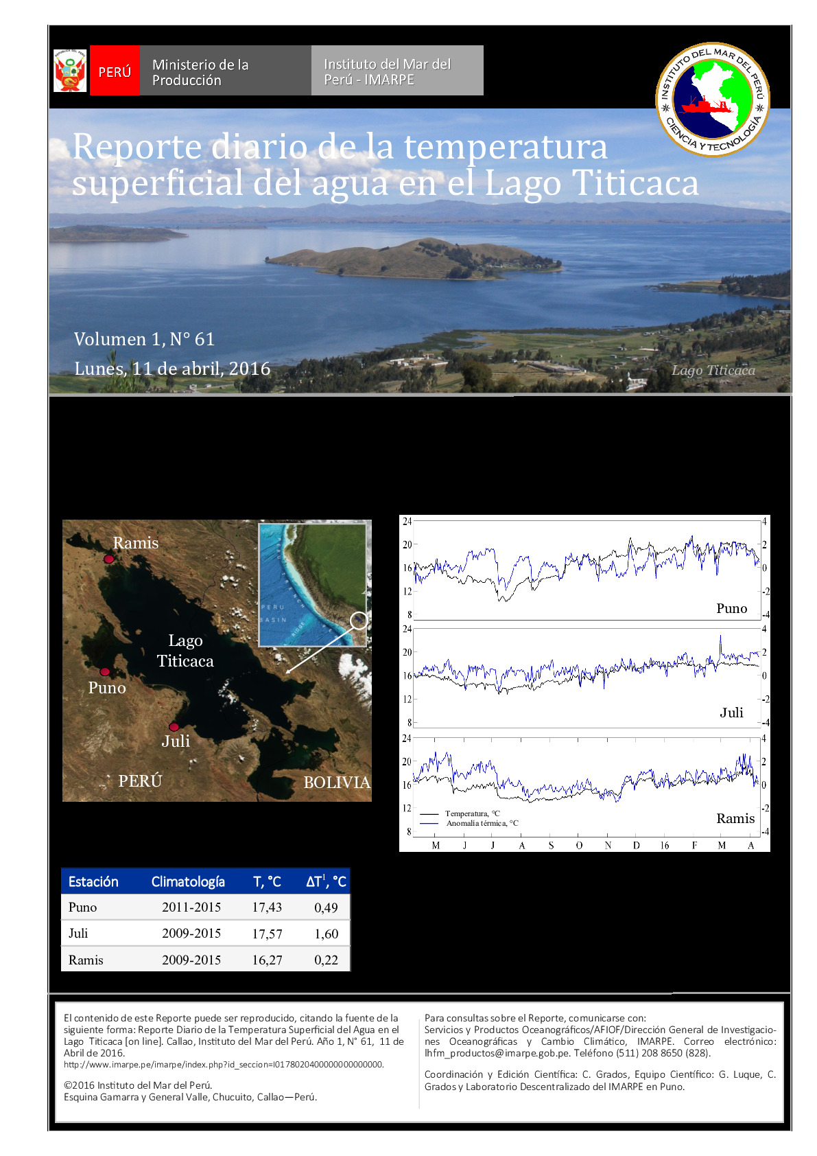 El Reporte tiene el propósito de informar a las sociedad de las variaciones diarias de la temperatura superficial del agua del lago Titicaca en las estaciones limnológicas que administra el IMARPE en las localidades de Puno, Juli y Ramis