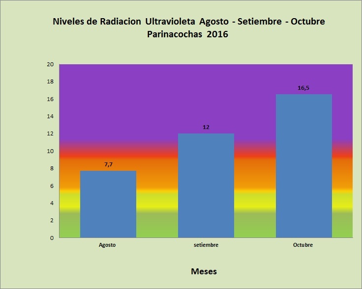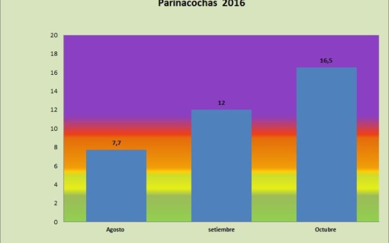 La Municipalidad Provincial de Parinacochas en Coordinación con la Gerencia de Recursos Naturales y Gestión del Medio Ambiente, reportan los niveles de radiación ultravioleta, equipo instalado en las inmediaciones de tal Municipalidad, registrándose los valores máximos por día, con niveles promedios mensulaes de agosto, setiembre y octubre, registrandose el valor mas elevado en el mes de octubre (16.5 radiacion UV-B).