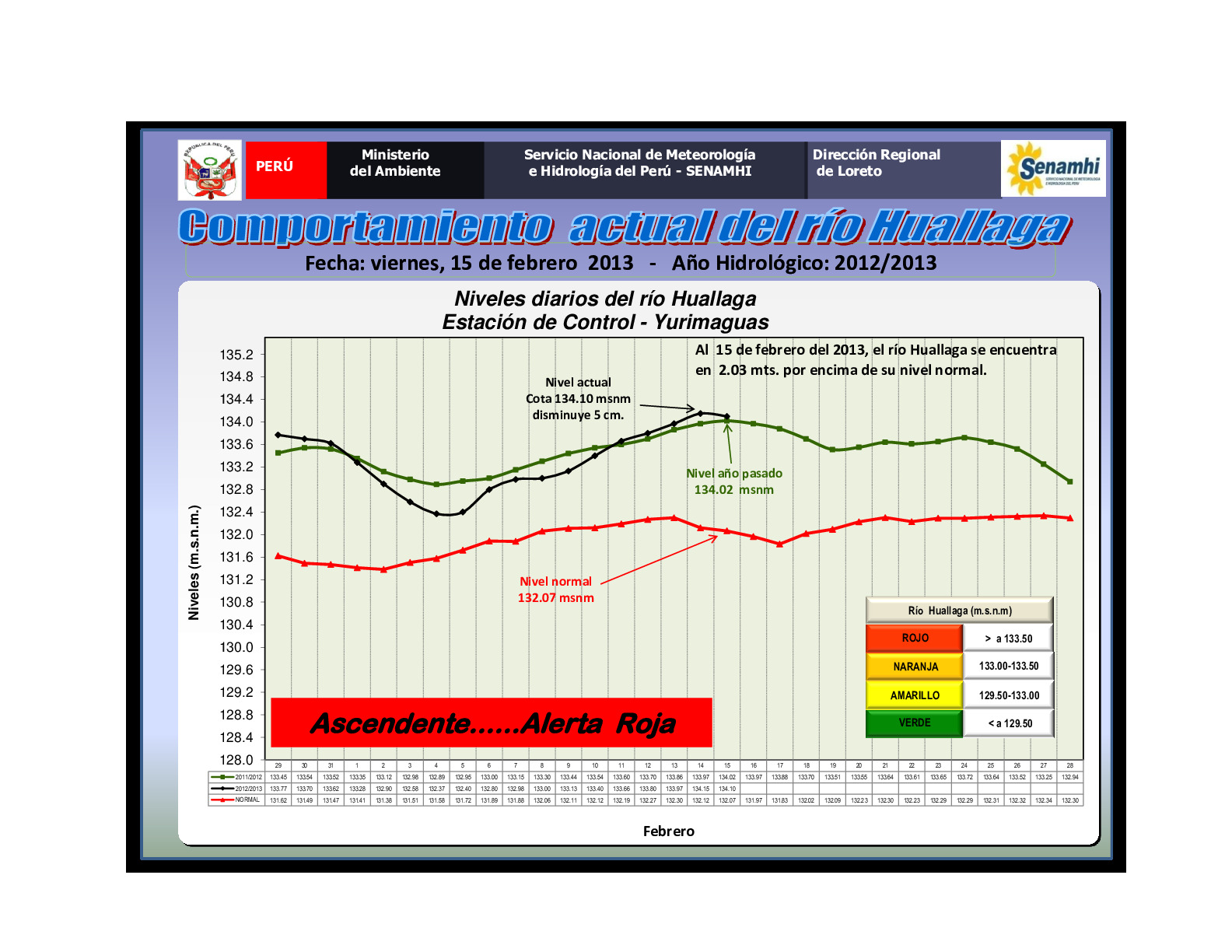 El río Huallga al 15 de febrero del 2013 tiene un comportamiento ascendente , encontrándose en alerta hidrológica roja, con un disminución de 0.05 m respecto del día anterior;el reporte nos muestra una cota actual de 134.10 msnm, superior en 2.03 m y 0.08 m a su nivel normal y del registro del 15 de febreo del año 2012 respectivamente.