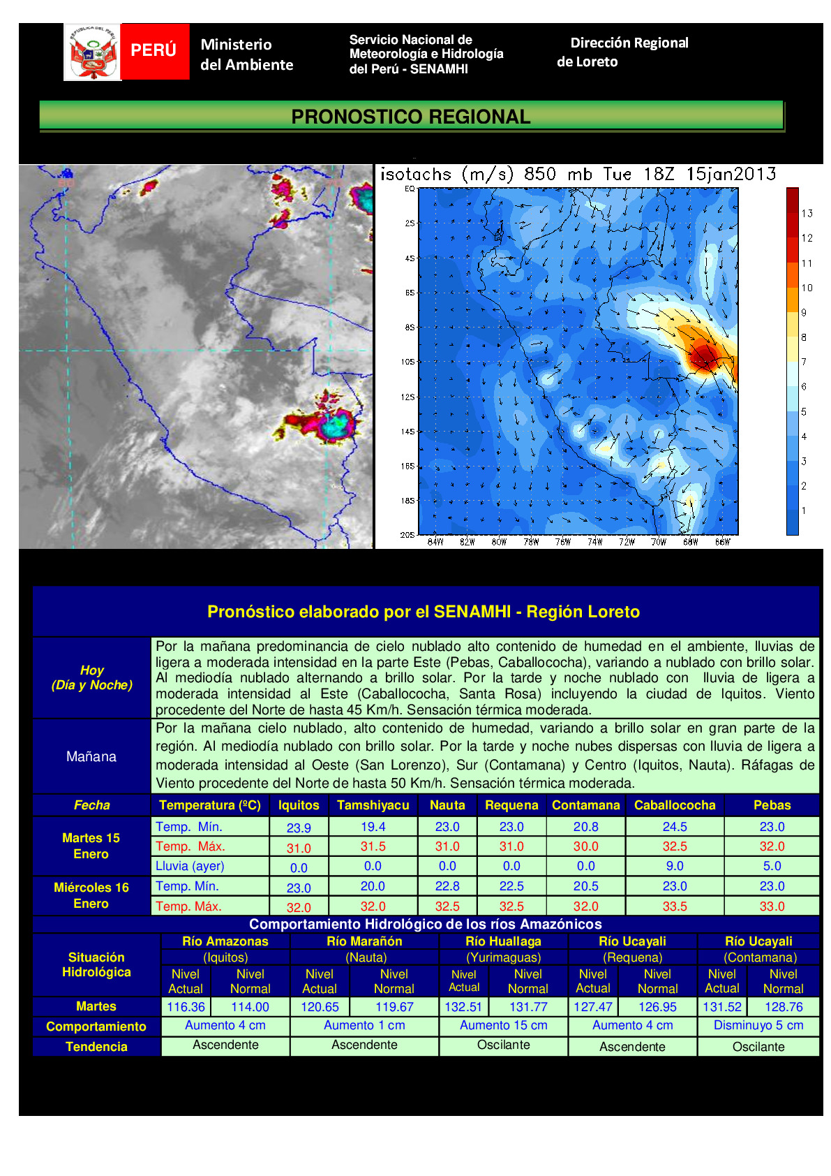 PRONOSTICO REGIONAL DIARIO Y COMPORTAMIENTO HIDROLÓGICO DE LOS PRINCIPALES RIOS AMAZONICOS – 15.ENE.2013