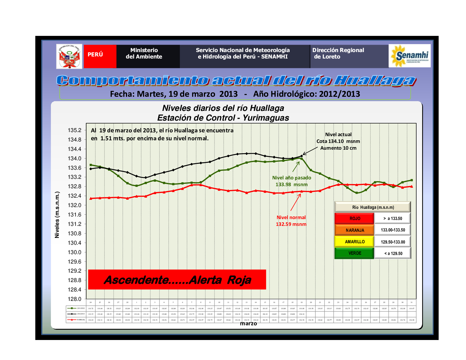 El río Huallga al 19 de marzo del 2013 tiene un comportamiento ascendente, encontrándose en alerta hidrológica roja, con un aumento de 0.10 m respecto del día anterior; el reporte nos muestra una cota actual de 134.10 msnm, superior en 0.12 m a su nivel normal y superior también en 1.51 m respecto del registro mostrado el 19 de marzo del año 2012.