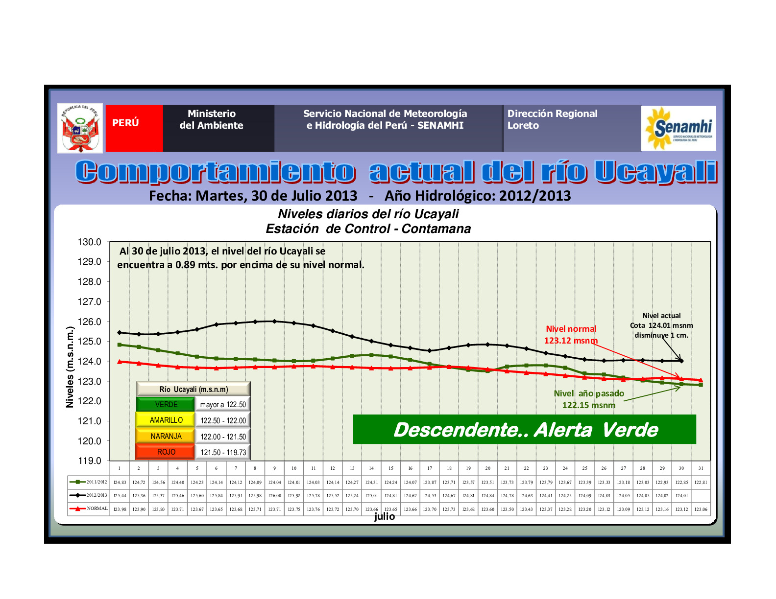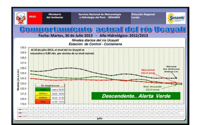 Al 30 de julio del 2013 los principales rios de la amazonía peruana se encuetran en alerta hidrologica verde mostrando un comportmiento descendente siendo los niveles mostrados en la cota de la fecha superiores tanto en los niveles normales como en los mostrado el año 2012 en lamisma fecha.