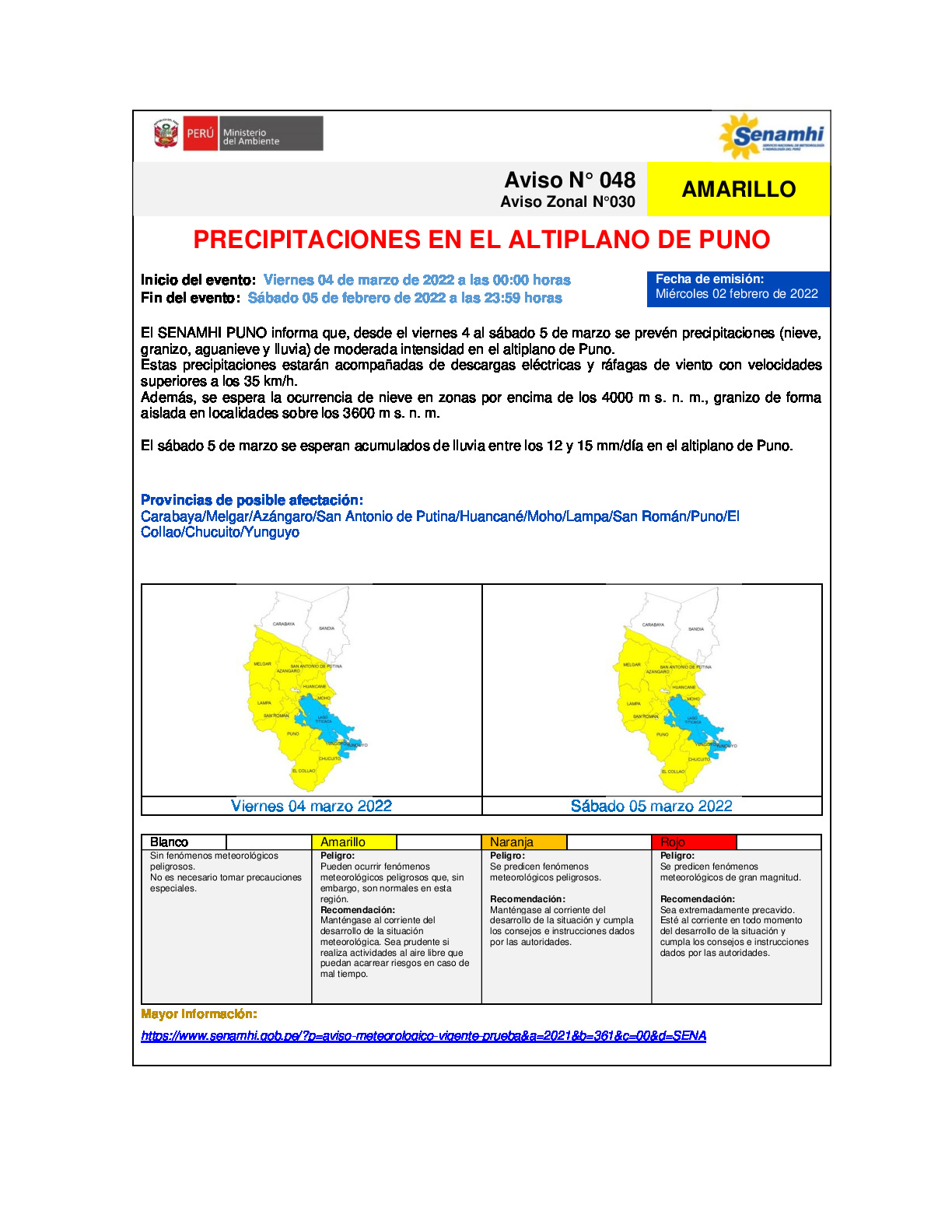 RV: Aviso meteorológico N° 048 - 030 DZ13 - Precipitaciones en el altiplano de Puno