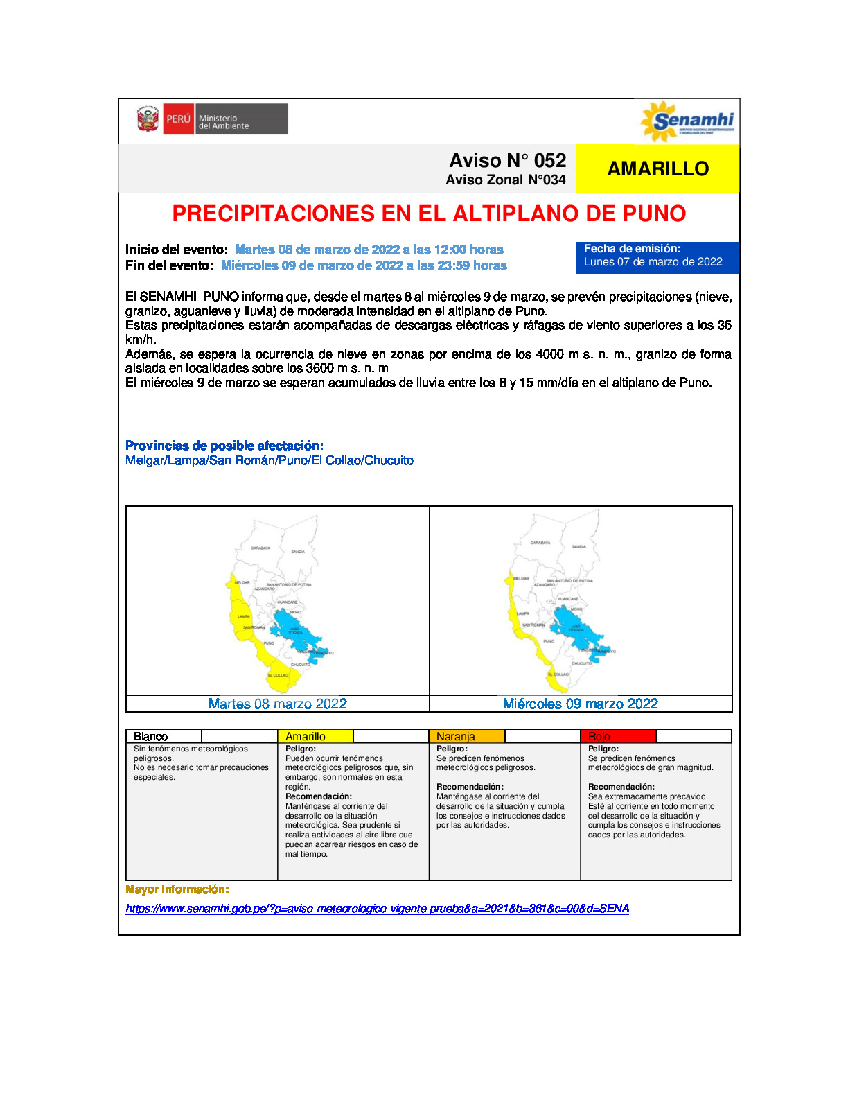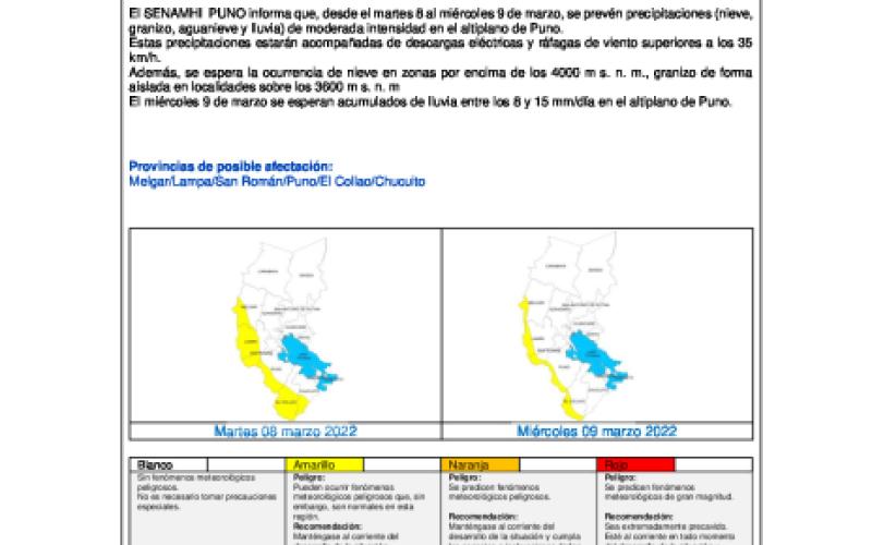 El SENAMHI PUNO informa que, desde el martes 8 al miércoles 9 de marzo, se prevén precipitaciones (nieve,