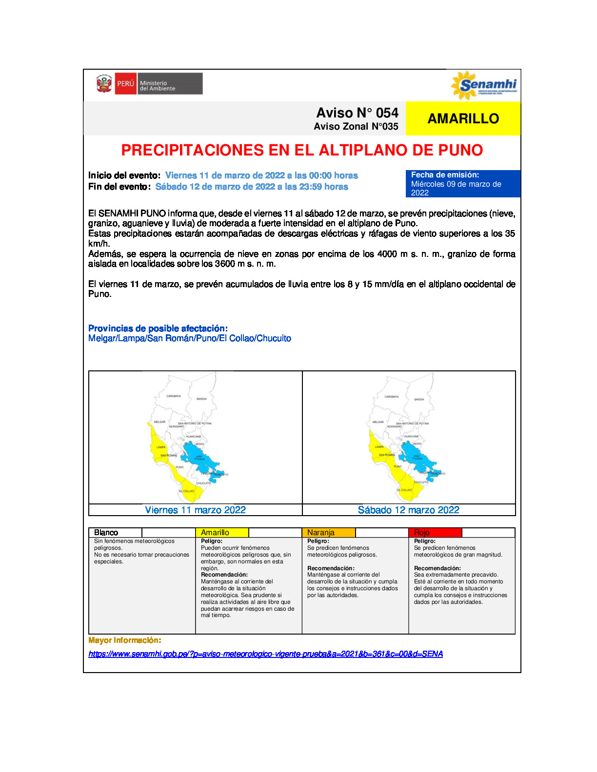 RV: Aviso meteorológico N° 054 - 035 DZ13 - Precipitaciones en el altiplano de Puno