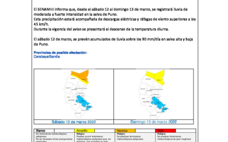 El sábado 12 de marzo, se prevén acumulados de lluvia sobre los 90 mm/día en selva alta y baja de Puno.