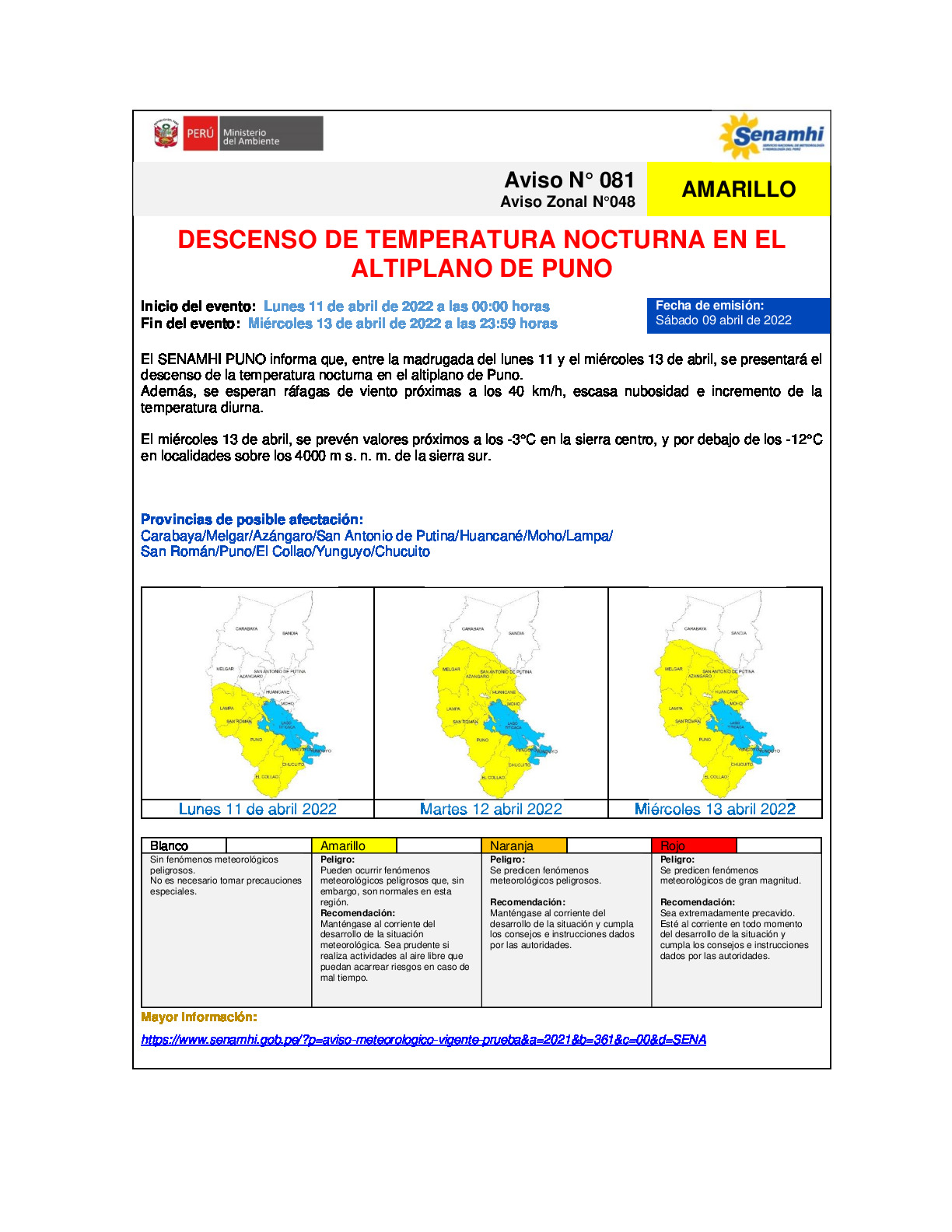AVISO METEOROLOGICO N° 81 DE DESCENSO DE TEMPERATURA NOCTURNA EN EL ALTIPLANO DE PUNO PARA EL 11, 12 Y 13 DE ABRIL 2022.