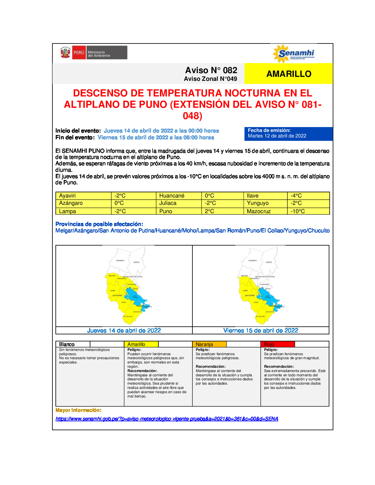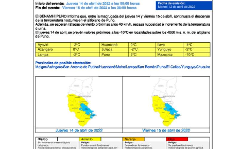 AVISO METEOROLOGICO N° 082 DE DESCENSO DE TEMPERATURA NOCTURNA EN EL ALTIPLANO DE PUNO PARA EL 14 Y 15 DE ABRIL 2022
