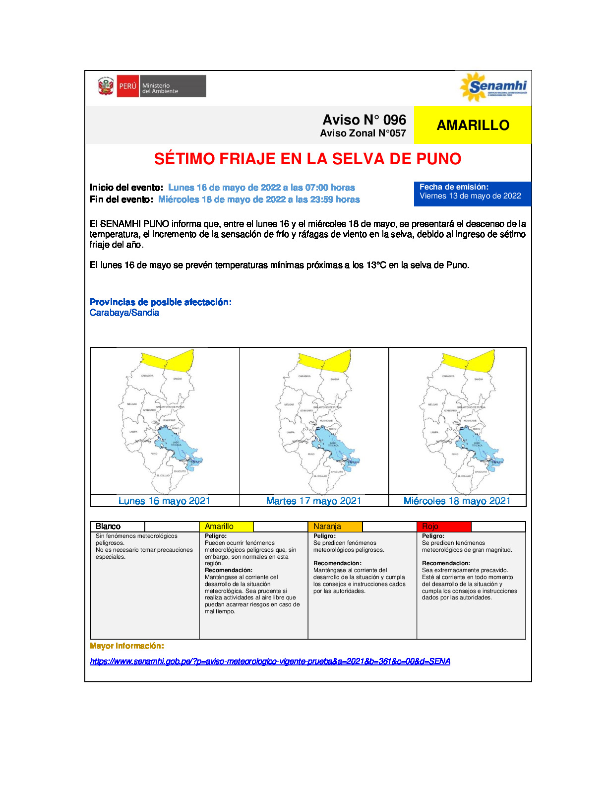 El SENAMHI PUNO informa que, entre el lunes 16 y el miércoles 18 de mayo, se presentará el descenso de la temperatura, el incremento de la sensación de frío y ráfagas de viento en la selva, debido al ingreso de sétimo friaje del año.