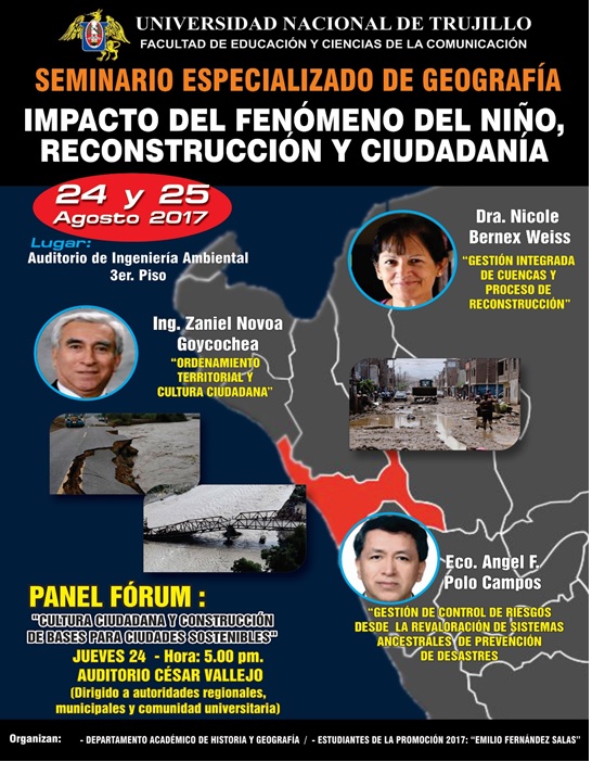 El próximo 24 y 25 de agosto se realizarán el Seminario especializado “Geografía del fenómeno del niño y la reconstrucción con ciudadanía” en el auditorio de Ingeniería ambiental y el Panel Forum: “Cultura Ciudadana y Construcción de Bases para ciudades sostenibles”, en el auditorio César Vallejo de la Universidad Nacional de Trujillo.