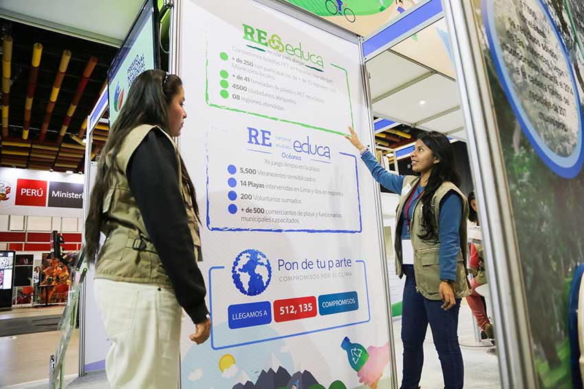 El Ministerio del Ambiente (Minam) está presente con su stand Ambiente en Acción y el Stand de los servicios del informcion del SINIA. Allí expone su labor por Perú sostenible que todos queremos y merecemos. Durante el recorrido, guiado por funcionarios del sector ambiente y jóvenes voluntarios ambientales, la ciudadanía podrá informarse sobre gestión del Ministerio, sus los principales logros y desafíos, asi como de los avances en materia de acceso a la información ambiental. Conocerá además cómo puede contribuir con su acción a través de la dinámica “Tú puedes hacer el cambio” y la iniciativa “Pon de Tu Parte”.