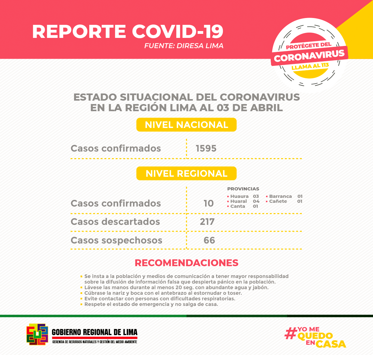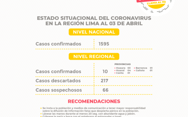 Región Lima: 10 casos confirmados │217 Casos descartados │66 casos sospechosos │01 fallecido.