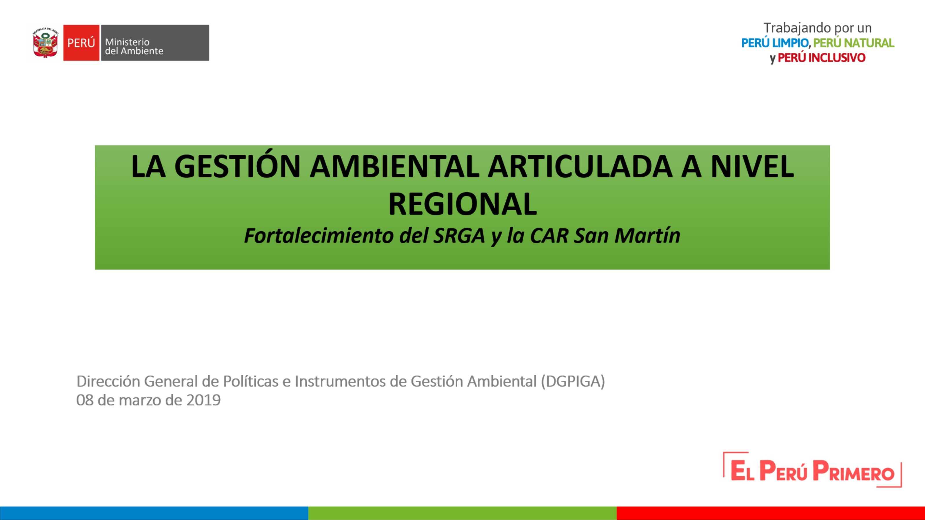 La Dirección General de Políticas e Instrumentos de Gestión Ambiental del Ministerio del Ambiente en coordinación con la Autoridad Regional Ambiental, realizó el pasado 8 de marzo del 2019 el primer taller de fortalecimiento de capacidades para la reactivación de la Comisión Regional Ambiental – CAR e implementación de la Política Ambiental Regional – PAR.