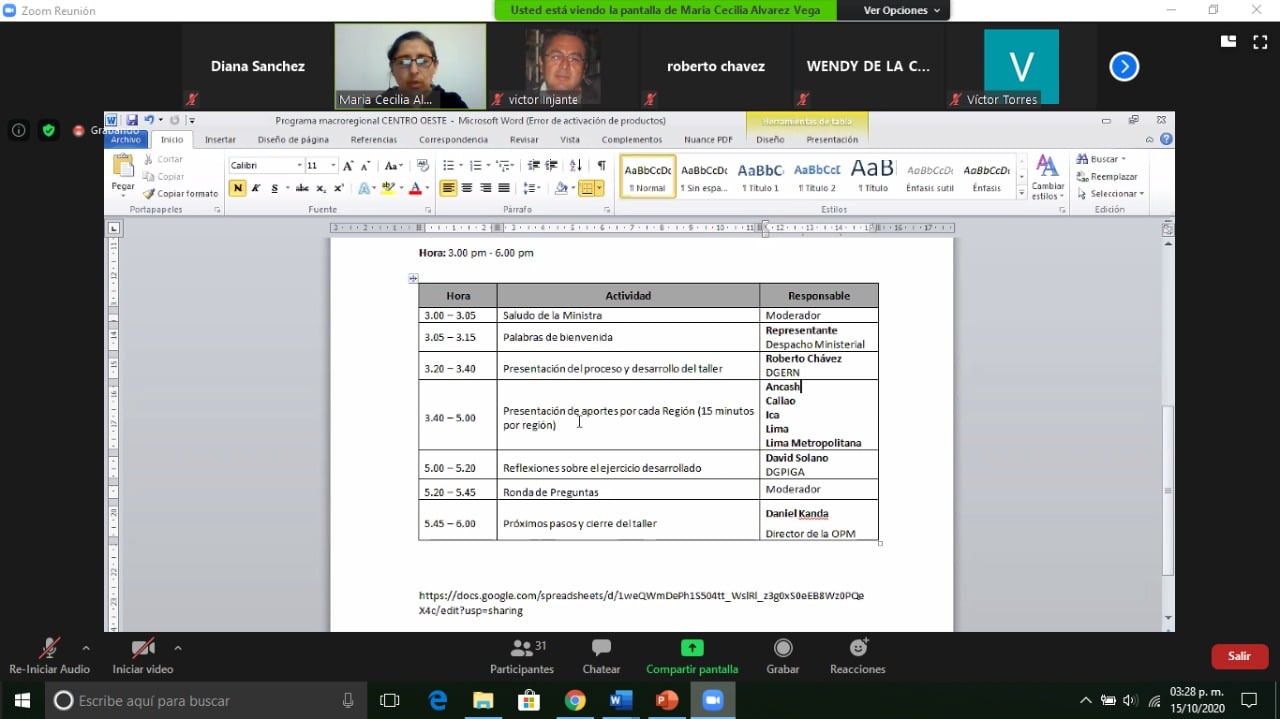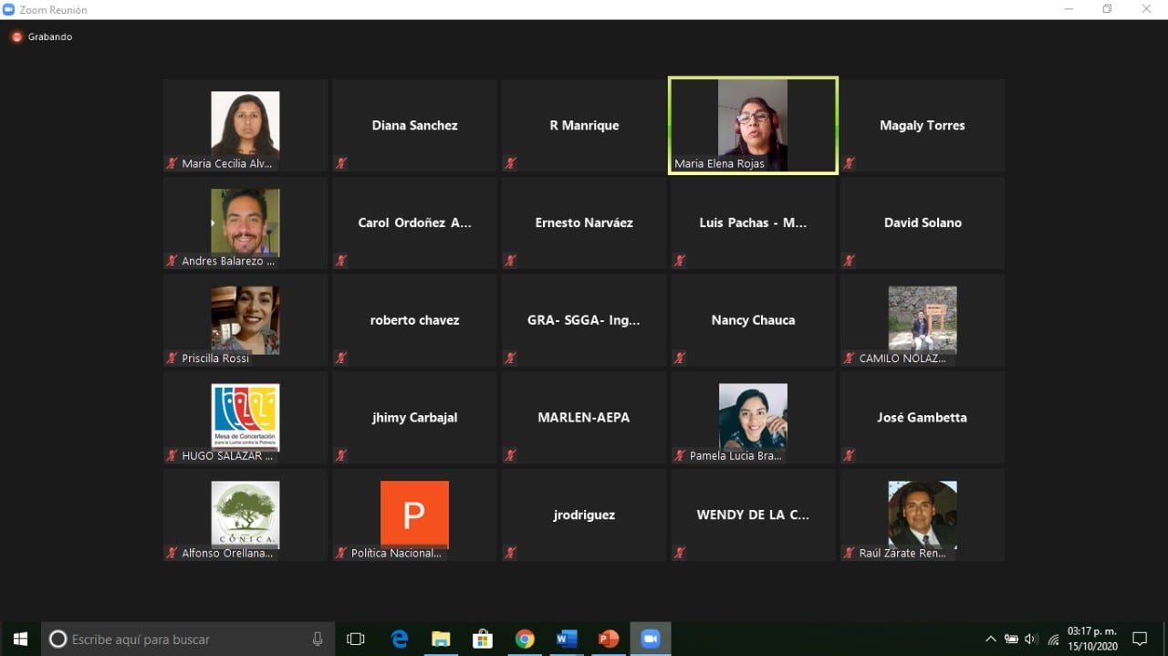 En estos momentos se viene desarrollando el "Taller Virtual Macroregional CENTRO OESTE - Proceso de Actualizacion de la Politica Nacional del Ambiente al 2030", en el cual, se encuentra participando reporesentantes de esta Gerencia como secretaría técnica de la Comisión Ambiental Regional; así también, participan representantes de esta Comisión Ambiental, quienes vienen aportando con sus opiniones trabajadas previamente en gabinete respecto al proceso de actualización de la Política Ambiental Nacional.