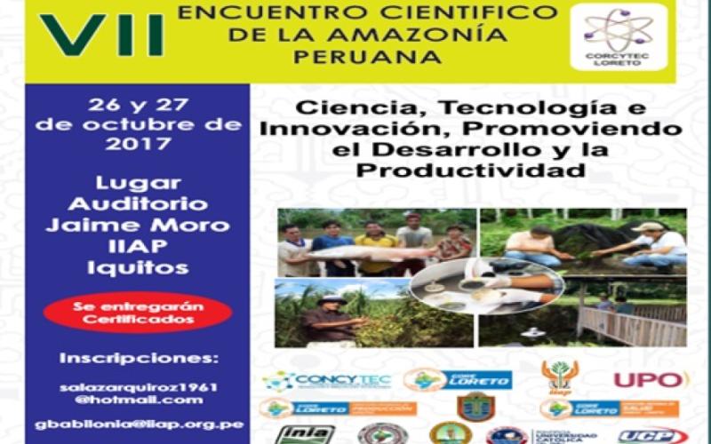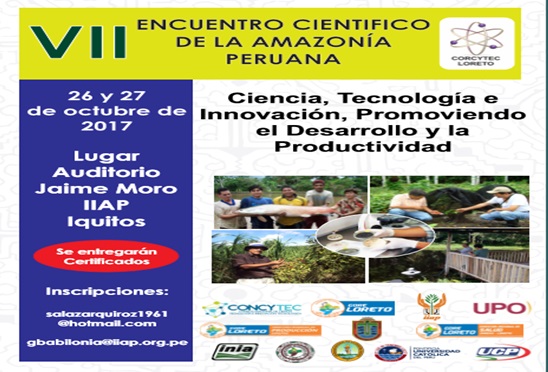 El Consejo Regional de Ciencia, Tecnología e Innovación de Loreto (CORCYTEC) integrado por el Gobierno regional de Loreto (GORE Loreto), la Municipalidad Provincial de Maynas, el Instituto de Investigaciones de la Amazonia Peruana (IIAP), el Instituto Nacional de Innovación Agraria (INIA), la Autoridad regional Ambiental (ARA) Dirección Regional de la Producción (DIREPRO), la Dirección Regional de Salud (DIRESA), la Dirección Regional de Educación (DREL), la Universidad Nacional de la Amazonia Peruana la Universidad Peruana del Oriente (UPO), la Universidad Privada de la Selva (UPS), entre otras instituciones locales, invita a los profesionales, estudiantes, empresarios y público en general al VII Encuentro Científico de la Amazonia Peruana.